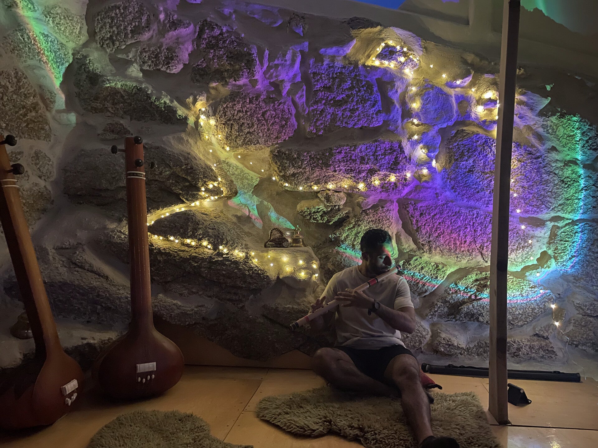 We take most of our classes and practice in the Shala. A large bright, acoustic space with windows on all sides with huge views of sky, forest and sunset. We we also have sunset Raag sessions outside. You will be shown some magical hidden spots on the land to be alone and connect with your flute and nature .